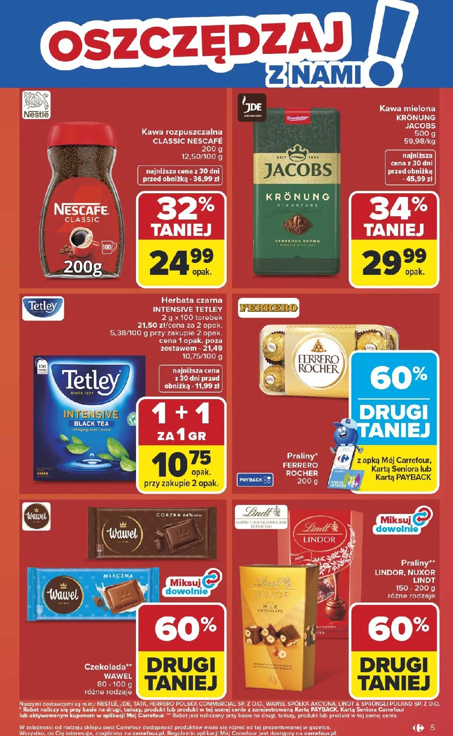 Wśród hitów tej oferty wyróżniają się soczyste pomidory malinowe Carrefour, dostępne za jedyne 9,99 zł/kg przy zakupie z Kartą PAYBACK lub Kartą Seniora (cena regularna 19,99 zł/kg). Nie przegap także kawy ziarnistej Tchibo Espresso lub Caffe Crema – opakowanie 1 kg kupisz za 69,98 zł, podczas gdy standardowa cena to 99,99 zł. Idealne do porannej kawy lub poobiedniego deseru.
