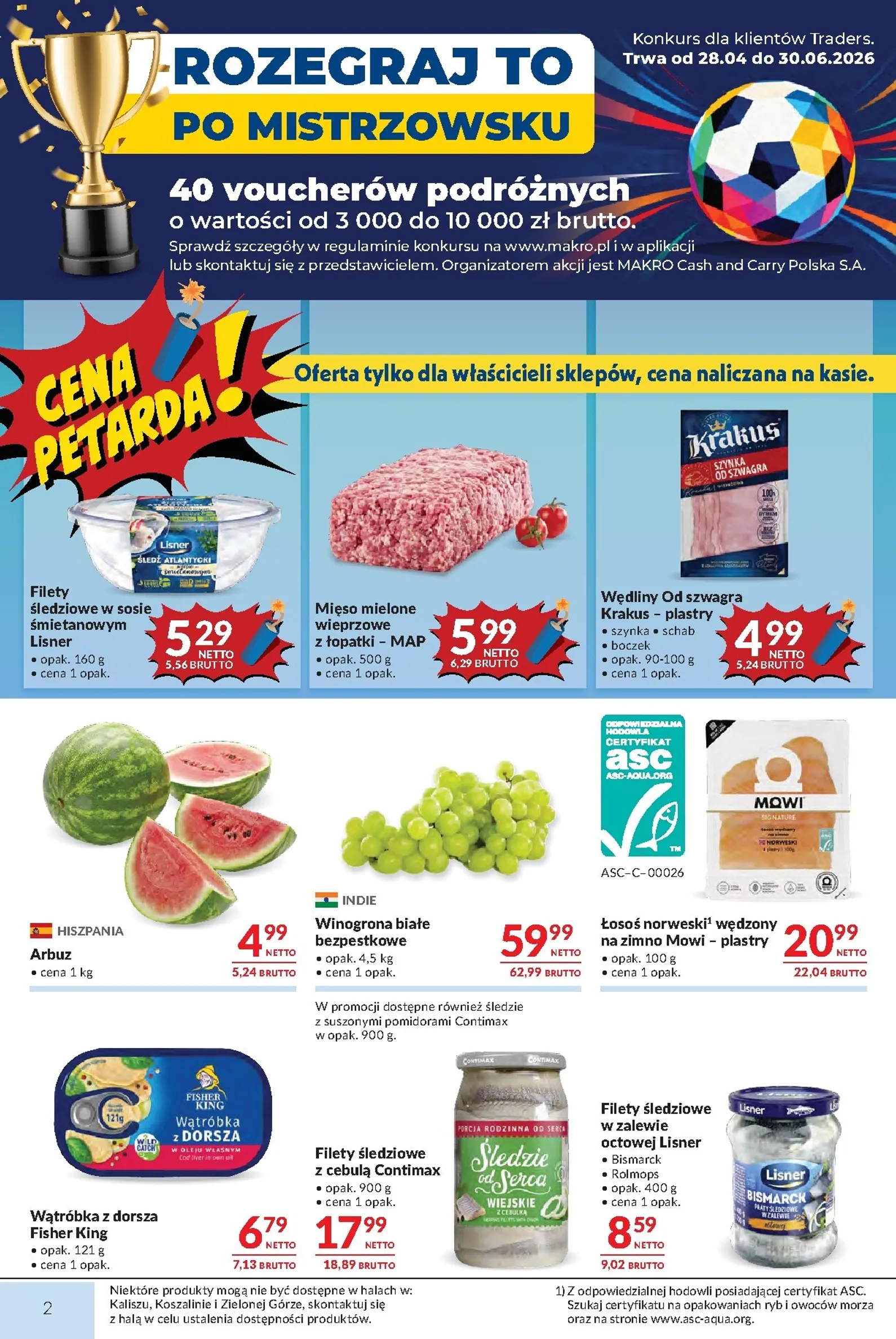 Kontynuując przegląd, zwróć uwagę na Mięso mielone wieprzowe z łopatki MAP (500g) za 5,99 zł. W ofercie także Filety śledziowe w sosie śmietanowym Lisner (160g) za 5,29 zł i Wędliny Ostrząg Krakuś plastry (100g) za 4,99 zł. Świeże owoce to arbuz z Hiszpanii za 5,24 zł/kg oraz Winogrona białe bezpestkowe (Indie, 4,5 kg) za 59,99 zł. Dla smakoszy ryb Makro proponuje Łosoś norweski wędzony na zimno Mowi plastry (100g) za 20,99 zł.